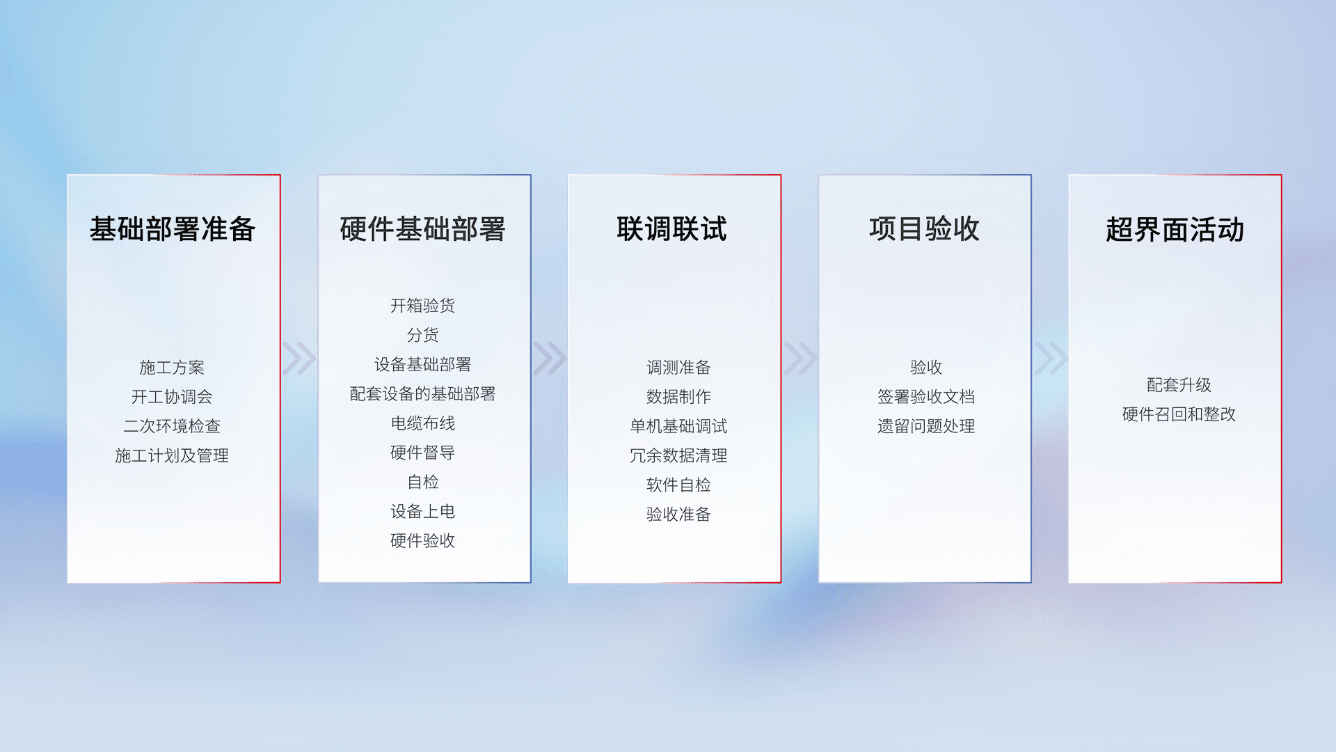 从基础部署准备、、硬件基础部署、、联调联试、、、项目验收、、、、越界面活动的全过程可追溯,,,,保证施工质量和进度。。。